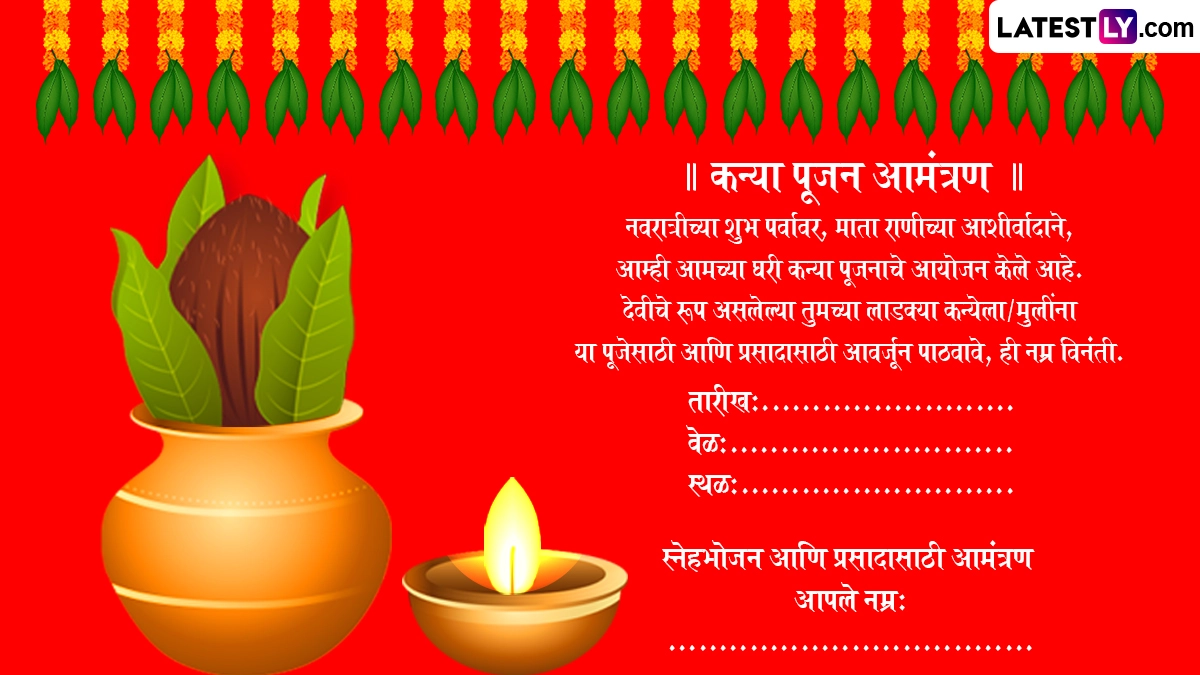 नमुना १: "सप्रेम नमस्कार, आमच्या घरी चैत्र नवरात्रीनिमित्त 'कन्या पूजन' आयोजित केले आहे. तरी आपल्या लाडक्या कन्येला देवीचे रूप म्हणून आशीर्वाद देण्यासाठी आमच्या घरी पाठवावे, ही नम्र विनंती."