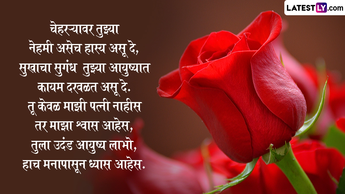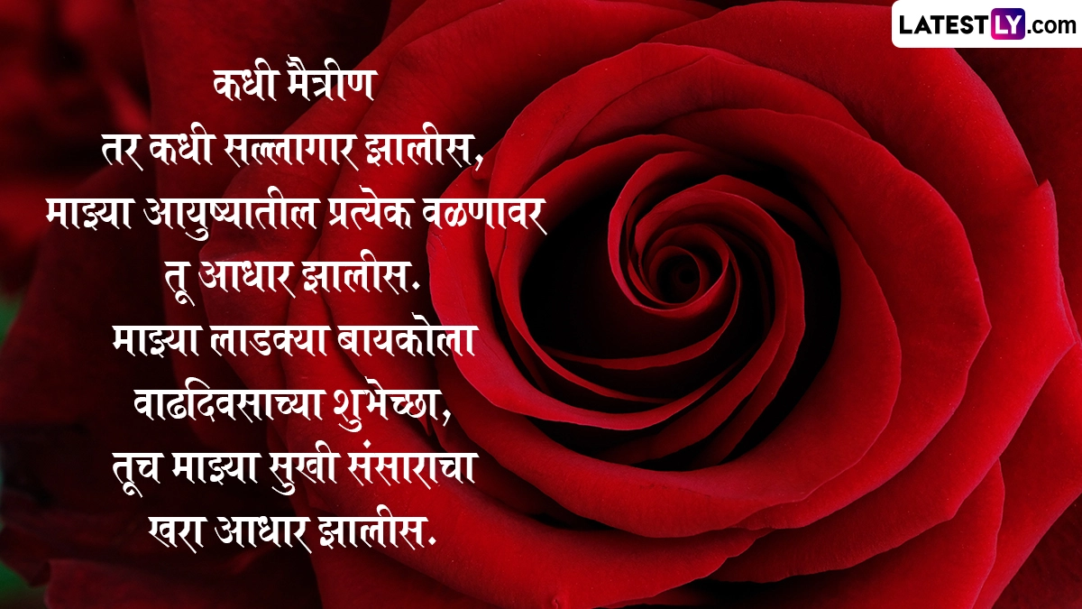 पत्नीचा वाढदिवस हा कुटुंबासाठी आनंदाचा आणि उत्सवाचा क्षण असतो. संसाराचा कणा आणि आयुष्याची अर्धांगिनी असलेल्या पत्नीप्रती कृतज्ञता व्यक्त करण्यासाठी अनेकदा शब्दांची कमतरता भासते. अशा वेळी सुंदर मराठी शायरी किंवा कवितेच्या ओळी आपल्या भावना प्रभावीपणे मांडण्यास मदत करतात. २५ मार्च २०२६ रोजी सोशल मीडियावर ट्रेंड होत असलेल्या काही निवडक आणि नवीन शुभेच्छा खालीलप्रमाणे आहेत. भारतीय संस्कृतीत पत्नीला 'गृहलक्ष्मी' मानले जाते. वाढदिवसाच्या निमित्ताने तिला दिलेला एक छोटासा संदेश किंवा पाठवलेली एक शायरी तिचे मन प्रसन्न करण्यासाठी पुरेशी असते. साध्या पण मनापासून व्यक्त केलेल्या भावना नेहमीच महागड्या भेटवस्तूंपेक्षा मौल्यवान ठरतात.
